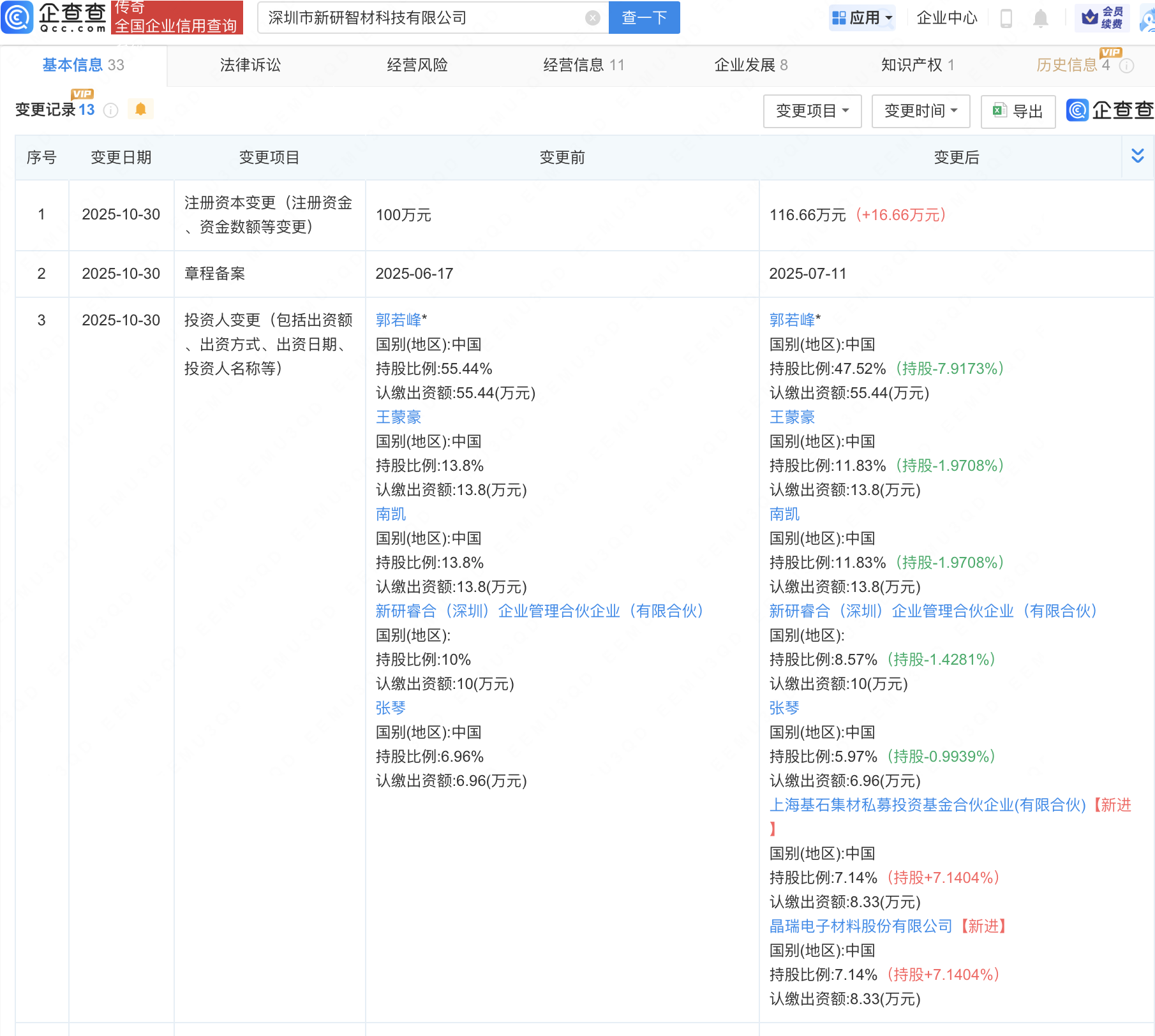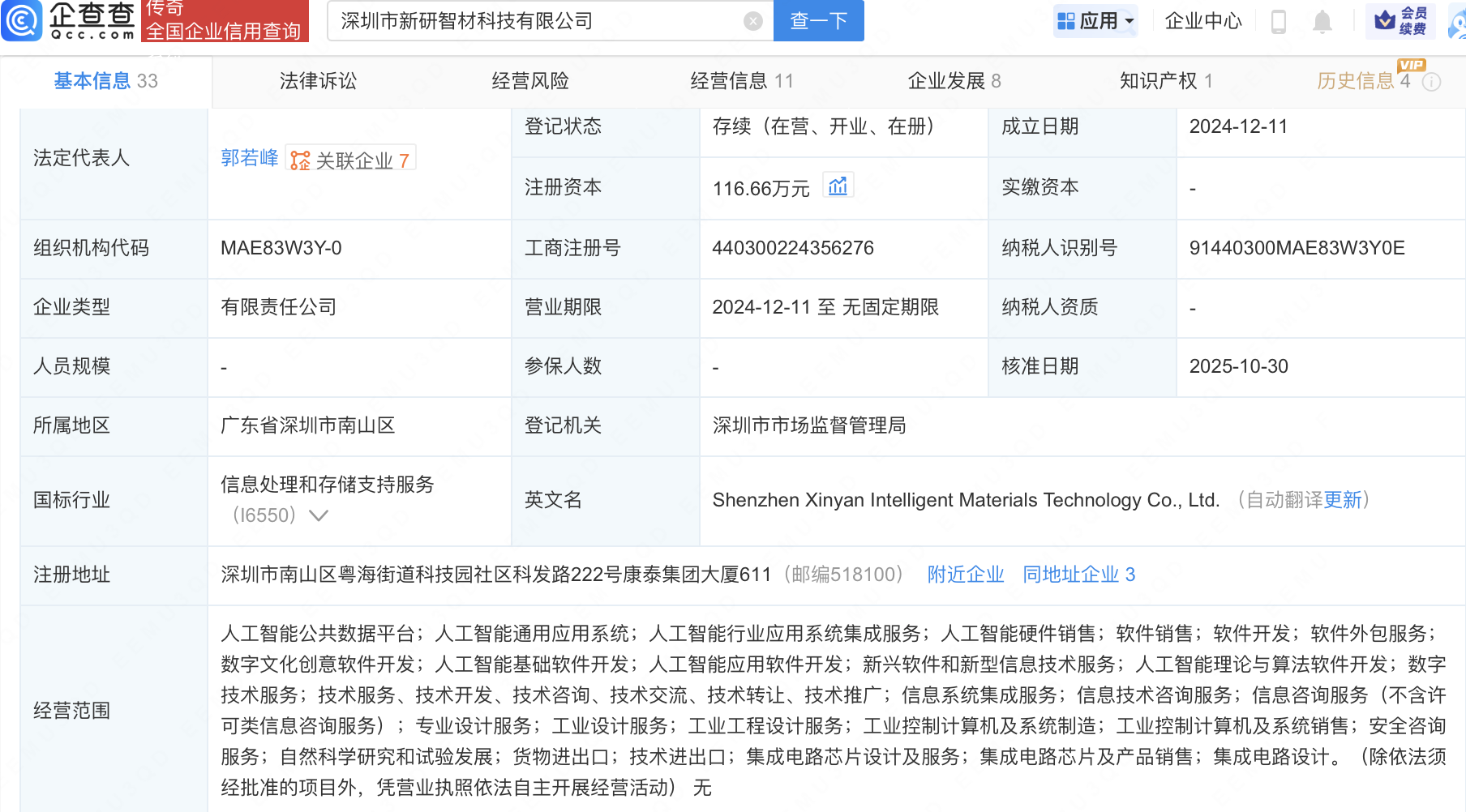 近日,深圳市新研智材科技有限公司发生工商变更怀远股票,新增晶瑞电材(300655)等为股东,同时注册资本增至116.66万元。企查查信息显示,该公司成立于2024年,法定代表人为郭若峰,经营范围包含:人工智能公共数据平台;人工智能通用应用系统;人工智能行业应用系统集成服务;人工智能硬件销售等。公开信息显示,新研智材是一家AI驱动材料研发的创新企业。