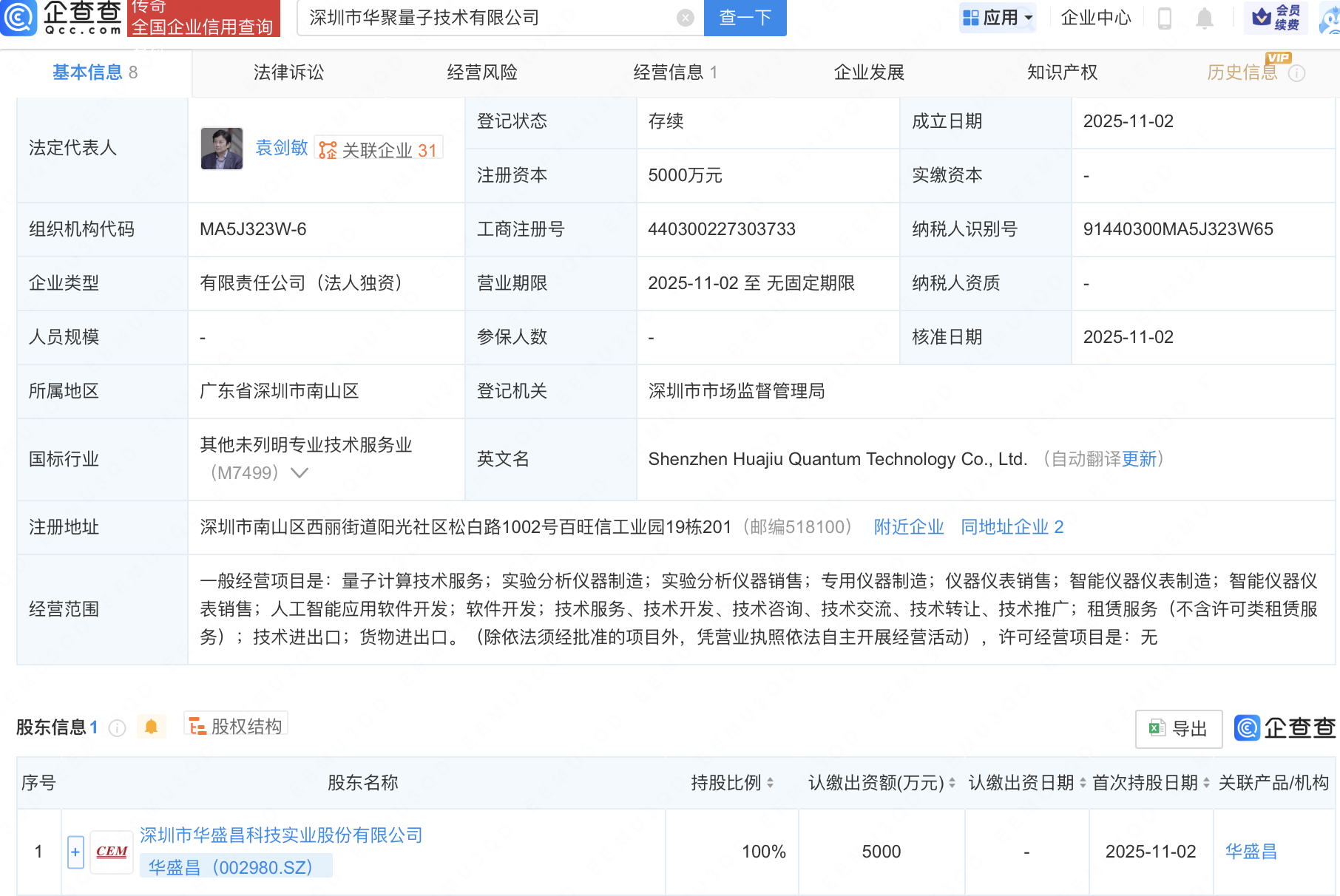 近日,深圳市华聚量子技术有限公司成立,注册资本5000万元,经营范围包含:量子计算技术服务;智能仪器仪表销售;人工智能应用软件开发;软件开发等。企查查股权穿透显示诚信双盈,该公司由华盛昌(002980)全资持股。