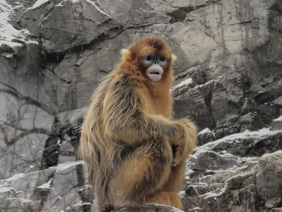 北京动物园川金丝猴雪中嬉戏。北京动物园供图