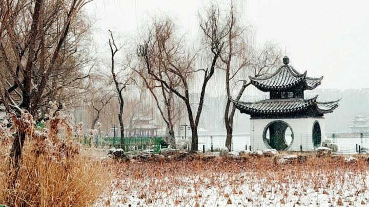 国家植物园卧佛寺中,色彩浓郁的红墙和簌簌落下的白雪形成强烈的色彩碰撞,鹅黄色的蜡梅傲雪绽放。香山公园中,山林寂静,林间小径被皑皑白雪覆盖,有一种隔绝尘世的美感。陶然亭公园,残荷成了皑皑白雪中的一抹亮色,和远处的吹台亭相映成趣。