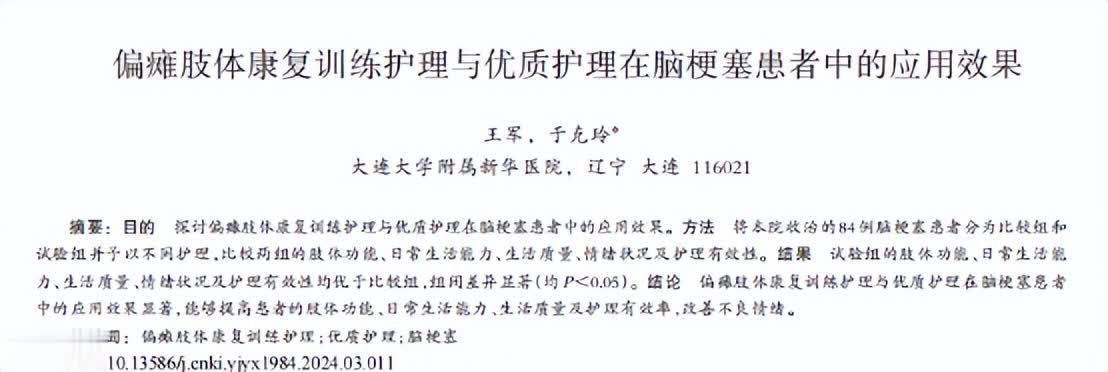 参考资料:[1]王军.偏瘫肢体康复训练护理与优质护理在脑梗塞患者中的应用效果,中国冶金工业医学杂志,2024-06-04