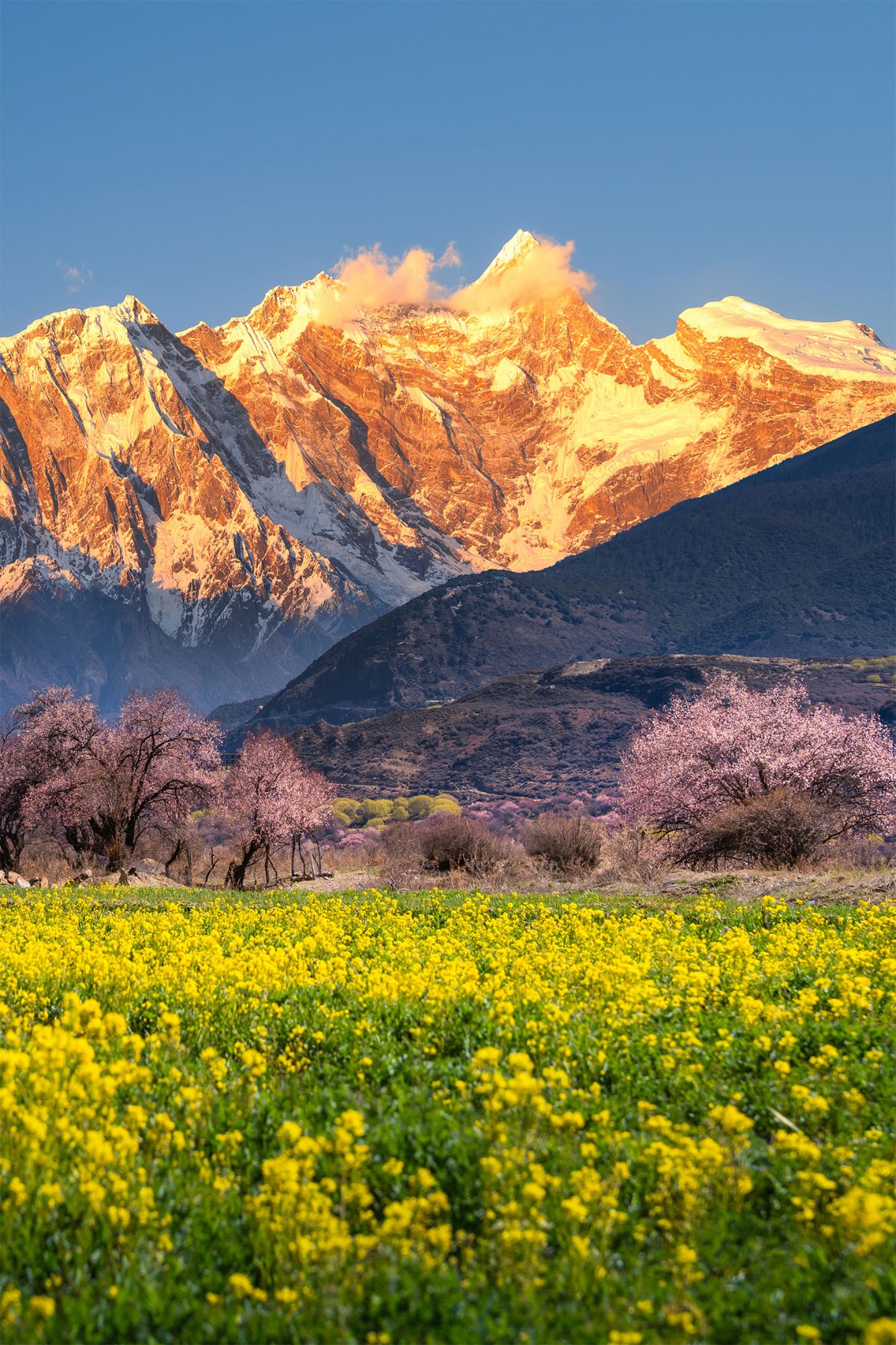 捕捉这份幸运需要精准把握时机,日出后或日落前20分钟的黄金时段,是神山“披金”的关键时刻。在藏文化中,日照金山本就是神山赐福的吉兆,“见者得福”的信仰催生了社交媒体上“刷到接好运”的现代仪式。若在梅里雪山偶遇金山与佛光同现,更是被称作“神赐双礼”,有游客描述:“当自己的影子映在佛光中,所有俗世烦恼都变得渺小。”这份跨越文化的精神共鸣,让每一次快门都承载着特殊意义。