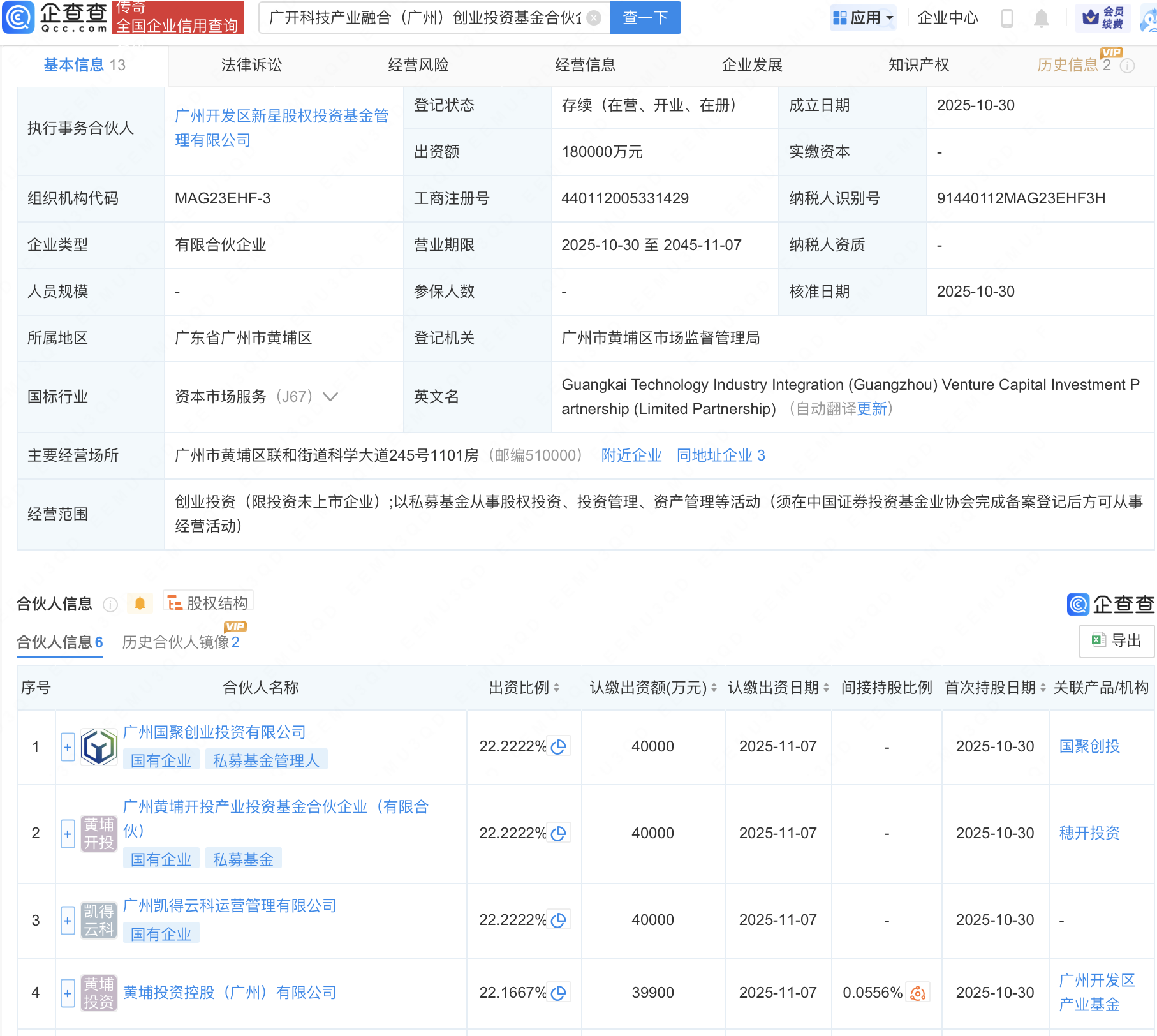 近日金橘策略,广开科技产业融合(广州)创业投资基金合伙企业(有限合伙)成立,出资额18亿元,经营范围包含:创业投资(限投资未上市企业);以私募基金从事股权投资、投资管理、资产管理等活动。企查查股权穿透显示,该企业由广州国聚创业投资有限公司等共同出资。