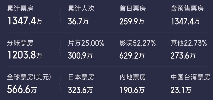 据猫眼专业版公示,《小林家的龙女仆寂寞的龙》内地上映30天票房累计1347.4万。为本影片海外第一大票仓。北美仅8.7万美元,248家电影院上映。