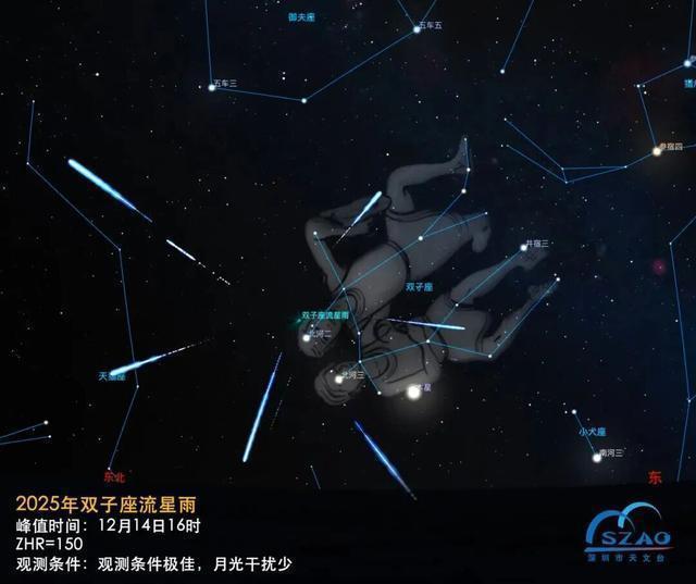 今年双子座流星雨极大时间落在12月14日上午,因此13日夜晚至14日凌晨最适宜观测,预计每小时天顶流量130颗左右。